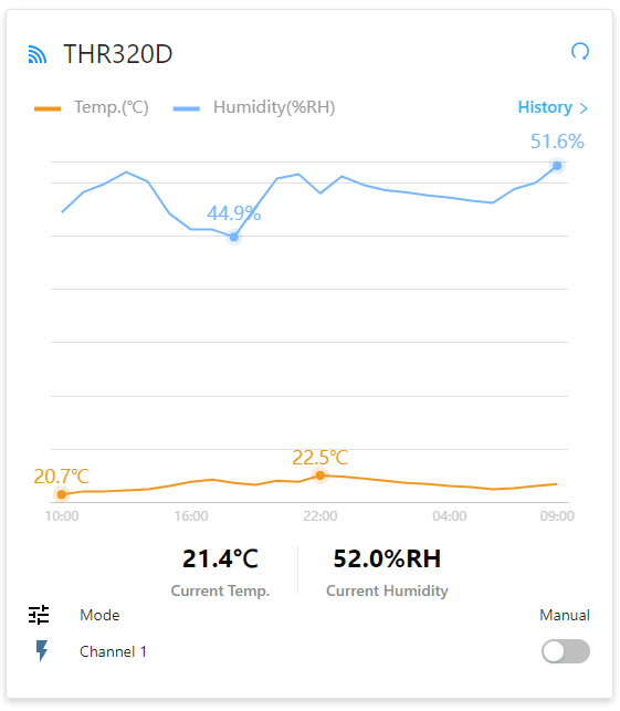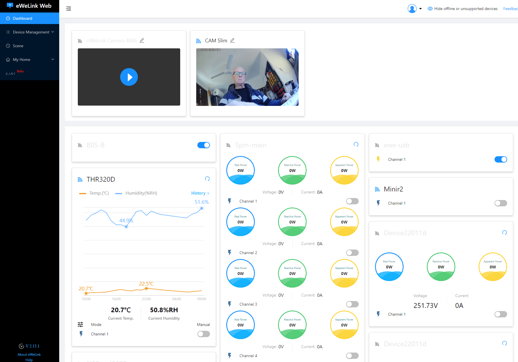 First off – you need their eWeLink ADVANCED PLAN account, that means instead of the normal FREE eWeLink APP – you pay them (I think) $9.90 or equivalent a year (I ignored this until now – figured it was just money-grabbing – but no – it seems pretty good) which gives you… well, what can I say – I simply signed up – opened this web page.. and up popped my devices JUST LIKE MAGIC. See those two video blocks in the above image? One is the security camera I refer to above, the other is my Sonoff CAM Slim (of the two, only CamSlim is active right now).. but the best example is my Sonoff THR320D sensor – see the detail below..