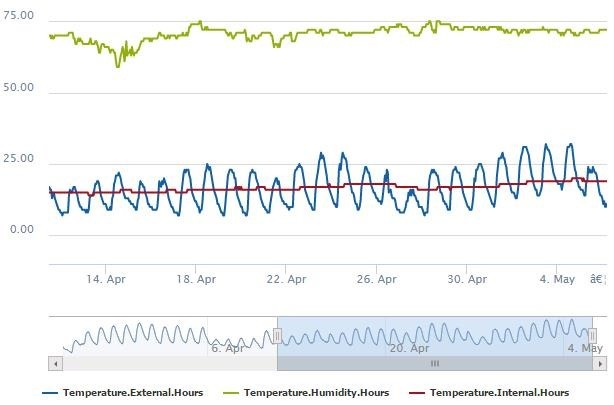 Here’s that temperature graph from the sensor in Spain. GroveStreams does an excellent job of overlaying internal and external temperatures with humidity.