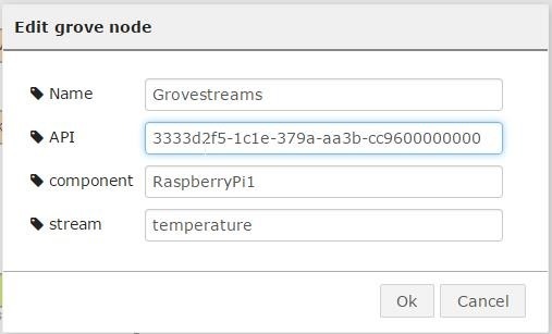 I made a nice simple dialog box. You can get an API key from your GroveStreams control panel and this is an example (a dummy example). As you can see I’ve given the node a meaningful name, the API key, the name of a “component” and the name of a “stream” under that component – a lot simpler than it looks. All the node needs is an incoming value and that’s it.