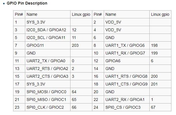 Meanwhile for that particular board, for those who’ve use FriendlyArm’s own software, there is of course the GPIO software which can be used by any user. However there’s a bug in that which I’ve reported.. gpio write 6 1 should turn on physical pin 6 – instead it turns on physical pin 22 (even the gpio number doesn’t match). I suspect they’ve copied the table over from another board and forgotten to update it. Physical pin 7 works. Of course it could be that they’ve messed something up in GPIO that is affecting other attempts to get to these ports.