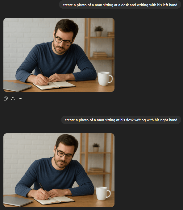 This dumb tech has NO idea that left-handed people exist – it’s simply trawling the web and taking images of people writing – and since the majority of those photos show right-handed people – the generated images ALWAYS come back right-handed – no matter HOW you phrase the request. As you can see from above – this is NOT just a case of mirroring. Both of the above guys are right-handed.
