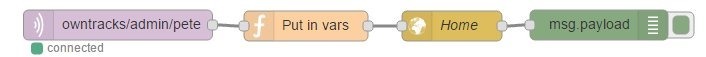 So from my incoming MQTT in a format decided by the App, not me I’ve created 2 items which the geofence node understands – regular updates as to where I am.