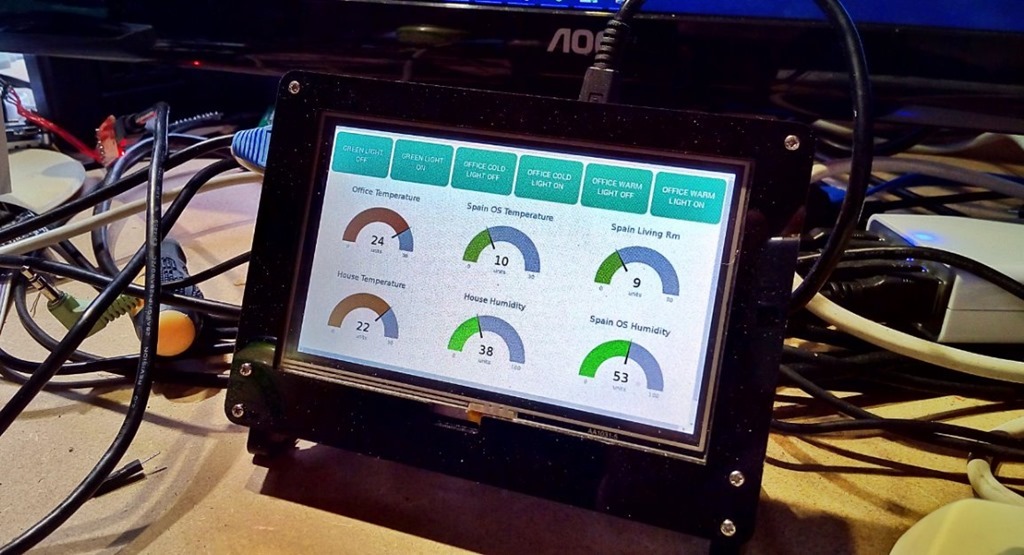 now I’ve had a 5” touch screen attached to a Raspberry Pi 2, using Node-Red Dashboard as a simple controller for my office – to turn lights on and off and keep an eye on temperatures etc. Works a treat using Chromium in “kiosk mode” – but two things have annoyed me – one being that menu from Node-Red Dashboard – the second being the ability of the browser to fail occasionally due to connection issues and put up a stupid message instead of trying to reconnect. Well, I may have cracked both of these as for the last few days the little unit has been sitting there rock-solidly doing it’s job.