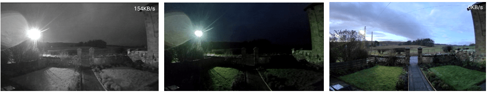 See photos taken early this morning – why I only just thought of this is beyond me – there’s a quite disgustingly bright council street light just across the road which runs all night through to sunrise. Absolutely no need for IR lighting. Take a look below – IR lighting, no IR lighting, sunrise. With a very slight adjustment I could improve the IR-free night image immensely and save precious battery power in the process.