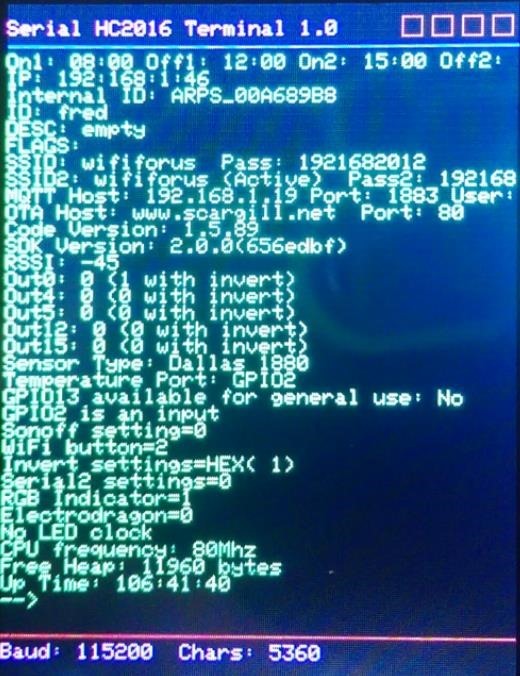 See the manual – the page entitled EXPERIMENT – just updated it – basically string output is one of the home control commands now (experimental at this point) – and so MQTT is sending all traffic to this unit – in technocolour – lots of improvements possible but speed wise the ESP version now managing 200us per character. Not bad.