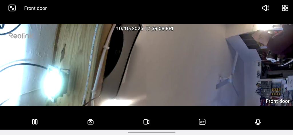 I simply plugged the camera into my PoE-equipped network lead, waited a moment or so and the floodlights came on temporarily then went off. I went to the Reolink app on my Android phone and the Reolink Duo 3V PoE device magically appeared as an uninitialised device. I hit the grey area where I’d expected an image and was asked to create a username and password. That’s it for the instructions – end of setup. The resulting image was a very wide image of my office as the camera was lying upside down on the hallway bench.