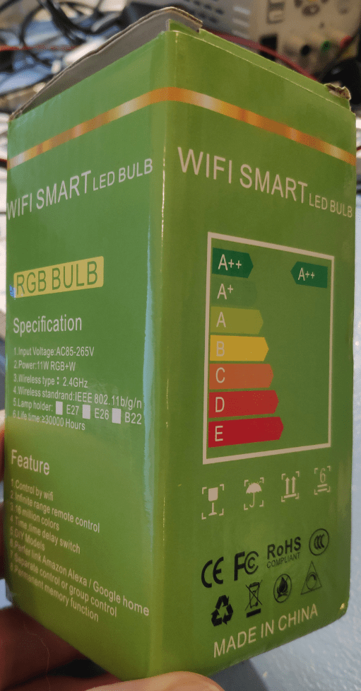This turned up from Banggood for me yesterday – an E27 (screw-fit) and it works well with the recommended, free Smart Life app. These bulbs also work with Amazon Alexa and Google Home.