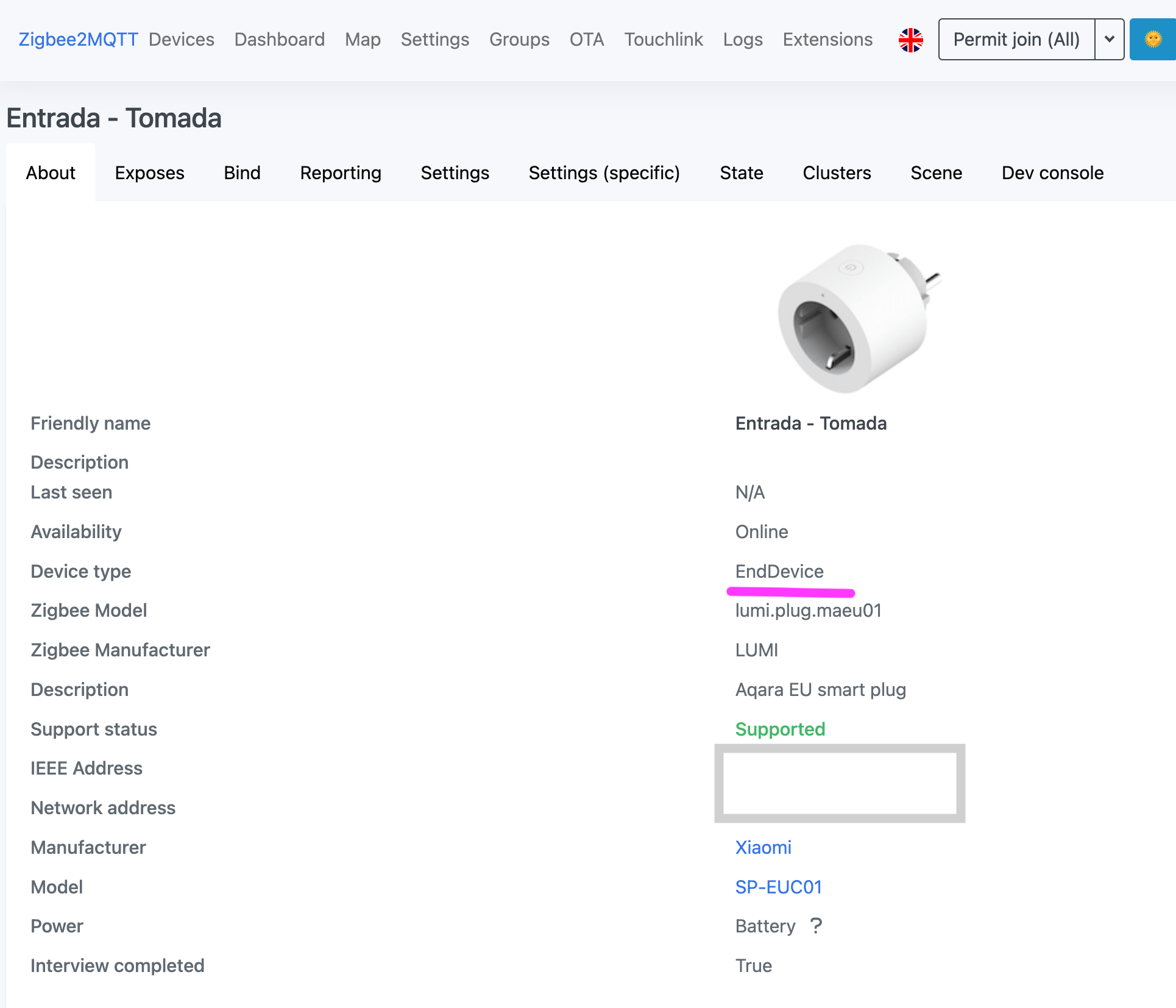 When I plugged the device into the mains, that little hole near the top lit up momentarily in blue then went dead as it’s supposed to. Some devices start up flashing to indicate they are not paired with anything – but not all – so – I went off to my Zigbee2MQTT overview panel and pressed Permit all (join) before returning to the plug and long-pressing that button on the top. The hole in the plug started to flash RED.