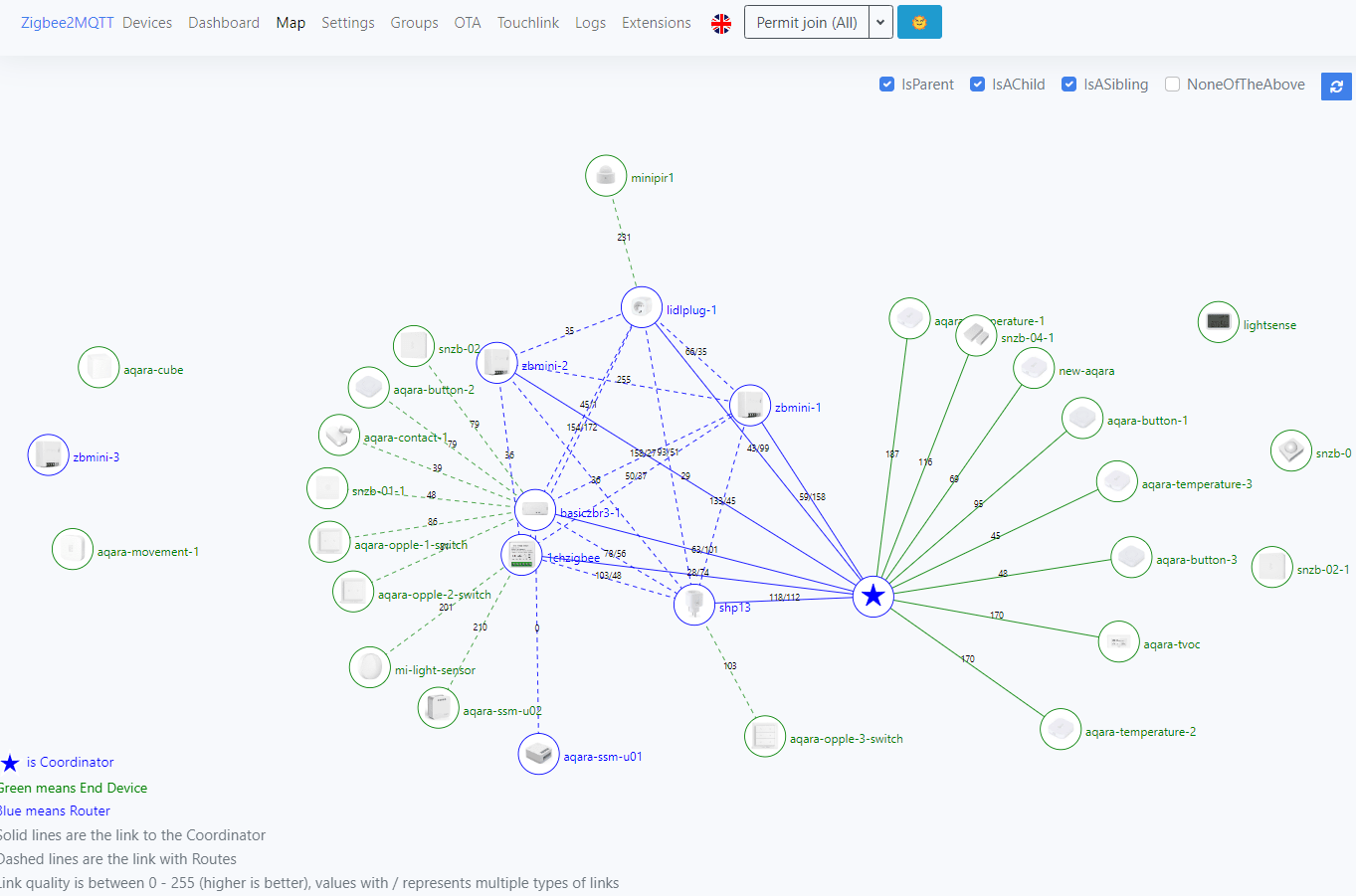 In blue are the mains-powered devices which are doubling up as routers – in green, typically battery powered sensors which for obvious reasons cannot spare the power to be routers.