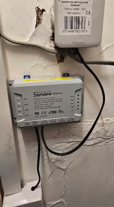 Meanwhile, the same Sonoff box is getting power from an existing lighting switch socket which, thankfully, has neutral down at the very bottom of the picture. I am using quite thin mains cable because the amount of current that we are talking about here is negligible. Some day I’ll rip the whole lot apart, including that mess of a wall, put a new plasterboard up, and stick a din rail up there. But for now, we have only a couple of days while we’re here over the Christmas, and I wanted to get this up and running.