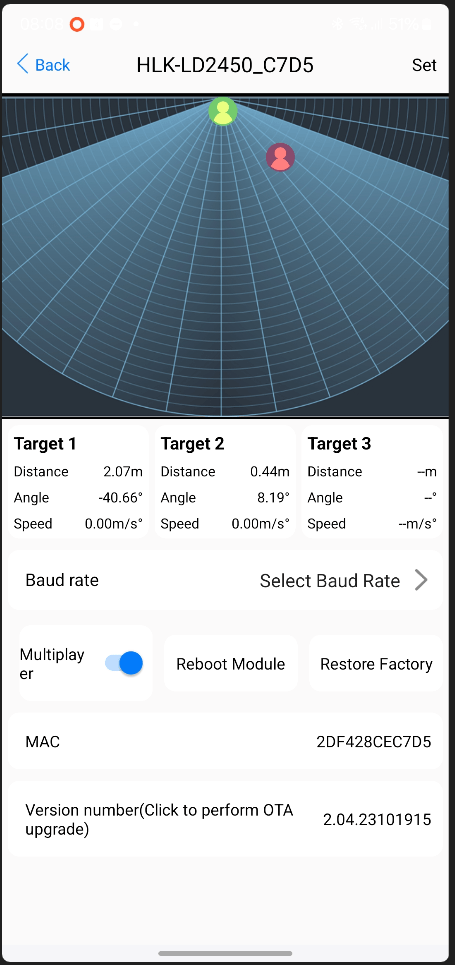 A couple of things – I’m still not sure I understand the radar well enough to comment on the MTR-1 and MSR-2 but there is someone who has gone into this – and from his write-up I discovered a free tool for Android/Apple called HLK Radar Tool – here’s a link to the article I read. And with both the modules in the same room as my phone – I get this output from the APP which is possibly Chinese as some of the text is a bit IFFY but the imagery is great – 2 images below from the 2 different devices..