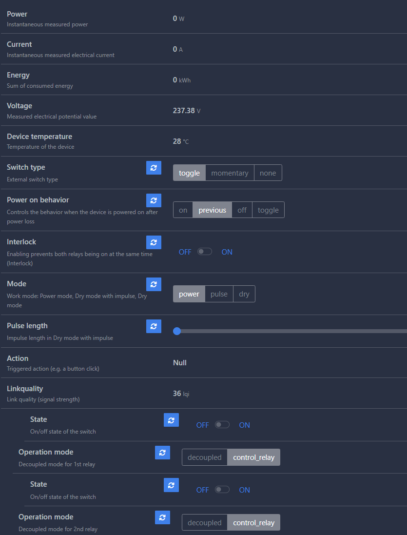 In HA I put the lights into PULSE mode and adjusted the pulse length to a couple of seconds – sure enough – turn either light on and it stays on for a couple of seconds then turns off – somewhat reminiscent of Tasmota’s PULSETIME though not quite as flexible as there are times when I’ve wanted to have a device start up OFF and then go ON after a short length of time. Of course there’s a way around that if using Home Assistant.