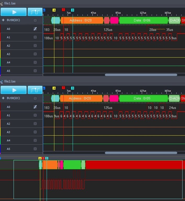 The resulting image above clearly shows the two I2c streams – one sending out 0x05 to address 0x20, the other sending 0x06 … sure enough – in the code – they use 0x05 for one colour, 0x06 for the other. The software is nice – and easy to use. I could not find as zoom button but it took only a minute to realise that moving the data with the mouse while holding control – zooms in and out. Right now I’m trying to figure out how to make the DATA (A0) a brighter colour – it hardly shows up on this image.
