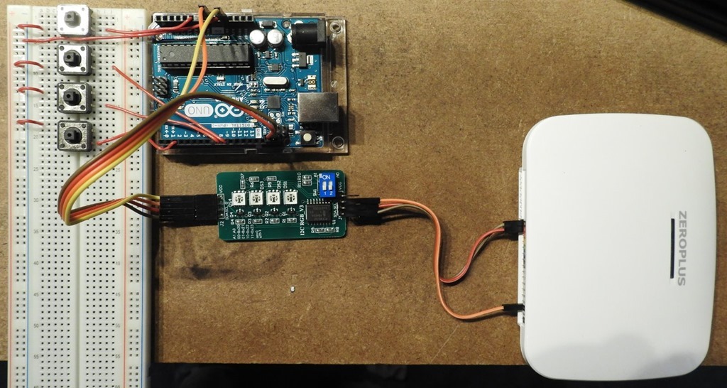 The setup for all of this could not be simpler – I didn’t need a power supply because the USB connection to the Arduino and the ZeroPlus analyser handled that, all I actually needed was two handy leads.