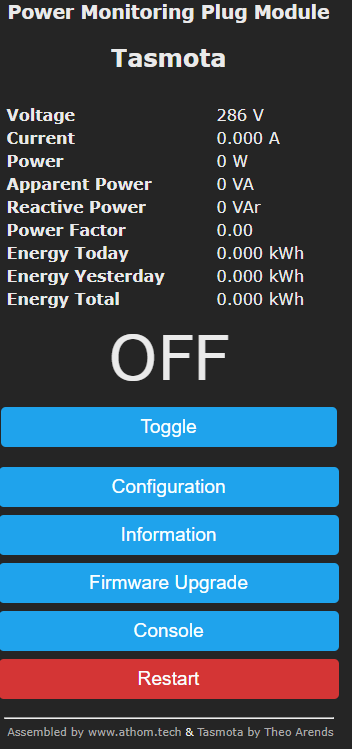 So what’s new about this? Nothing except that this is the simplest smart-socket setup I’ve ever done – no messing about removing cloud controls, no APP, SIMPLES. Within seconds, on my PC, at the address “http://athom1.broadband” the new power monitoring socket appeared, ready to go. The “.broadband” will vary from router to router. “.lan” is more common.