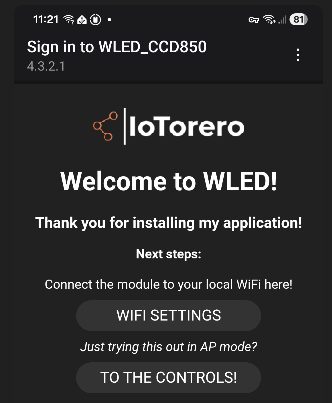 I look at my phone and WIFI settings – a new access point WLED_CCD850 shows up. I select that and…. I’m asked to select my WiFi access point and rename the device as is typical for WLED installations. Seconds later, done. I’ve renamed the device to IoTorero-LS6P.