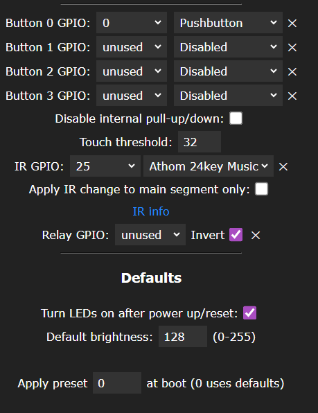 The device is already setup for the Athom 24-key IR keyboard (not supplied) but for sound I guess I’ll have to go looking at the WLED site. Looking at the setup in the wLED control panel – sound-reactive seems to be set up already. AH, Rainbow in this setup is not sound reactive that’s why. “noisemove” effect is definitely affected by my voice.
