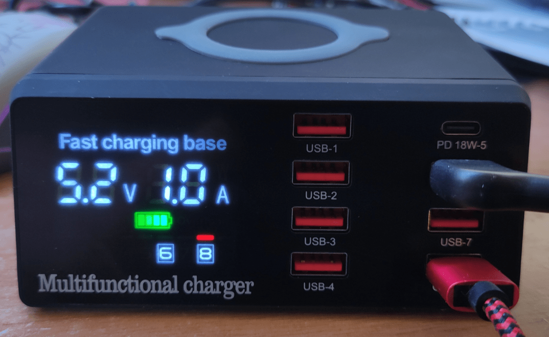 Doing the math, 5.2v @ 1.1A and 9.1v @ 2A = total 24W – i.e. LOADS of remaining capacity. As well as the above mentioned outputs there is a 10W wireless charger (the grey area on the top) but I don’t have a phone in this part of the building that needs this facility. This spec is a little concerning “Total Output Current: 5V-8A” which comes to 40W, not 100W, but I’m guessing that limit will be raised when using QC or PD charging as each of those can reach (in this particular charger) as high as 12v.