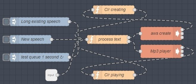 If the message already exists on my PI as an MPG file I use that, if not, I call Amazon Polly to create the file – my Node-Red code (a sub-flow) simply takes in some arbitrary text, checks to see if a file with the same name exists, if it does, it plays providing it isn’t already busy, if not already there, I have Amazon AWS generate the file then I do the test again, if anything else is playing, the message goes into a queue otherwise it get played. This is old stuff, documented on the blog.