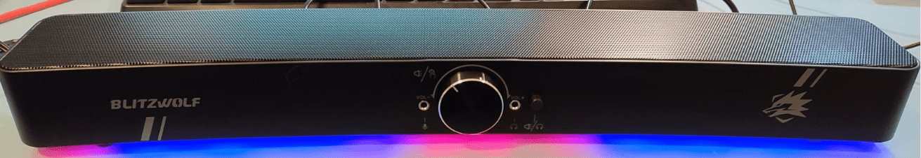 The sound output is stereo. Size is 779*66*51mm high – this will fit nicely under my LG PC monitor. There’s a microphone input (far better than having it on the front of my PC which sites way at the back of my desk) and a headphone/buds output together with selection switch. The unit has a simple combined on/off/volume/light control – a short press changes light modes and a long-press turns the unit on and off. NO bass/treble control but I can do that back in the PC mixer anyway.
