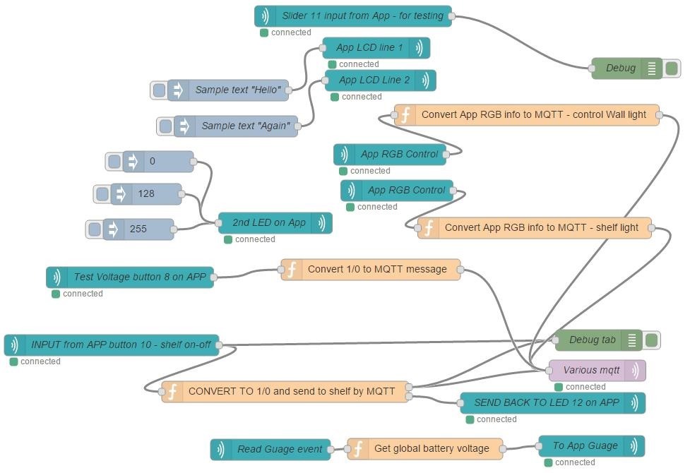 So – here is my little test app – and here is my NODE-RED info for controlling lights – notwithstanding some SEVERE restrictions mentioned above – this is actually running and doing things reliably.