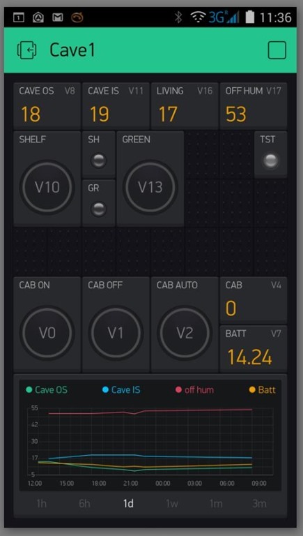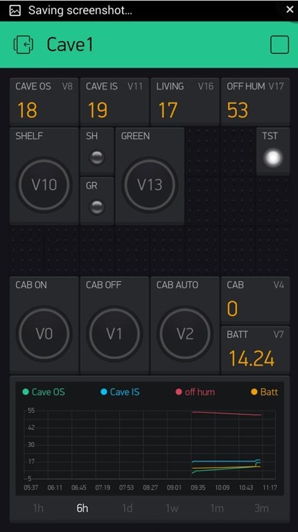 This is just for one of the guys at Blynk to show the graphing – but for everyone else, the state of my current Blynk app – running on a local Blynk server on a Raspberry Pi. 2 graphs – one shows day, one shows 6 hours. Also shows how quickly a page fills up!!