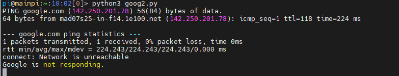 python3 goog2.py Error: PING google.com (142.250.200.110) 56(84) bytes of data. --- google.com ping statistics --- 4 packets transmitted, 0 received, 100% packet loss, time 139ms