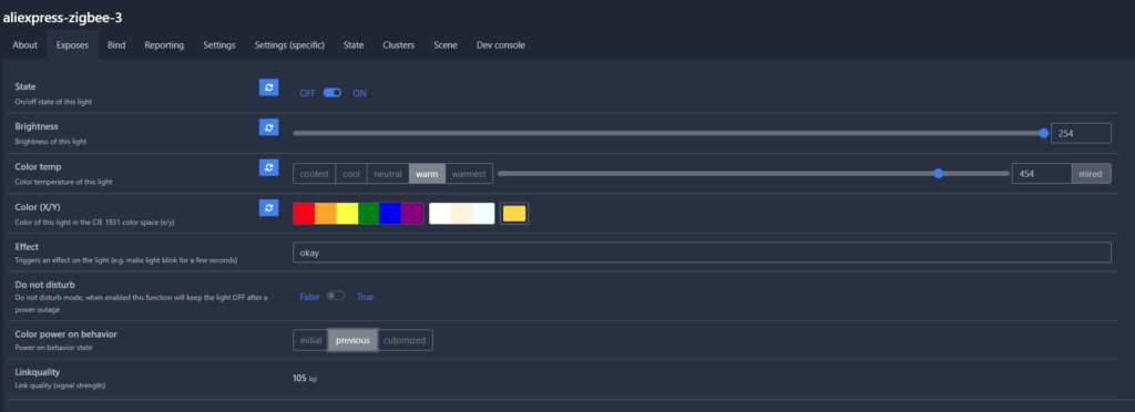 So what happened this time – this is a sub-€9 light (I’m giving you the link while not specifically recommending AliExpress) (note – first item – Zigbee, not one of the others which may be 110v or may be WiFi) – I’ve compared it with the previous (WiFi) light – side by side – output-wise the same – but works with Zigbee hubs and Im pleased to confirm IS supported by Zigbee2MQTT – which means that if, like me you happen to use the latter with perhaps a dongle in a Node-Red or other setup, you don’t have to go off buying yet another HUB.
