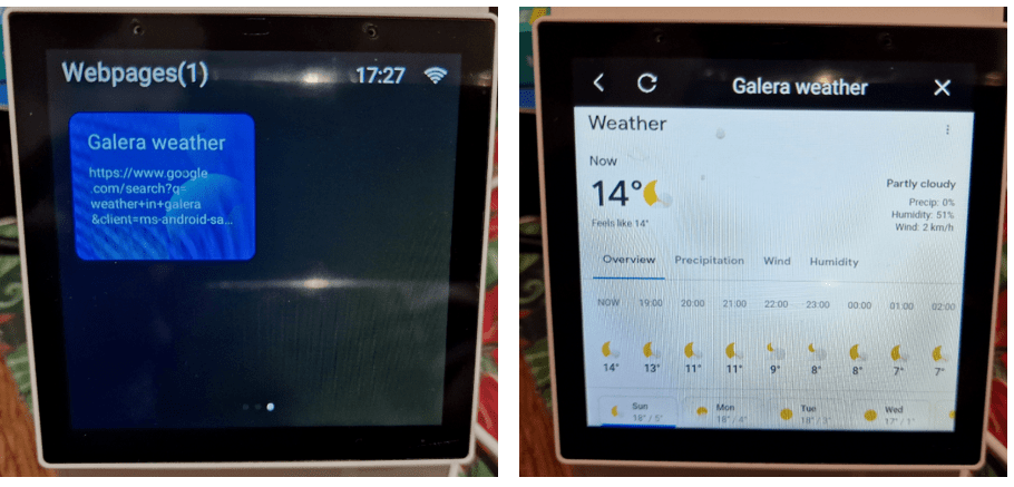 Anyway… I could not resist trying an experiment… I went into the eWeLink APP again and checked two things – one – web pages – THAT works – can put web pages (like the weather back in Spain) as blocks on one of the NSPanel screens – I say it works – it does – but I don’t see the point of the panel square showing the actual ugly URL. Looks like this feature was rushed a little. The pages themselves however look just fine.