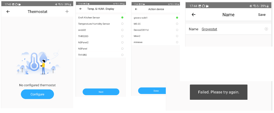 More importantly – the thermostat function. I put in the kitchen sensor and my not-suitable-but-good-for-a-demo Zigbee controller as an action, gave the stat a NAME and…. it would NOT save. THAT’s annoying…. I feel SURE that the thermostat function worked in my earlier black NSPANEL Pro but it’s not here so I can’t check. I can get no further than the inability to save a thermostat.