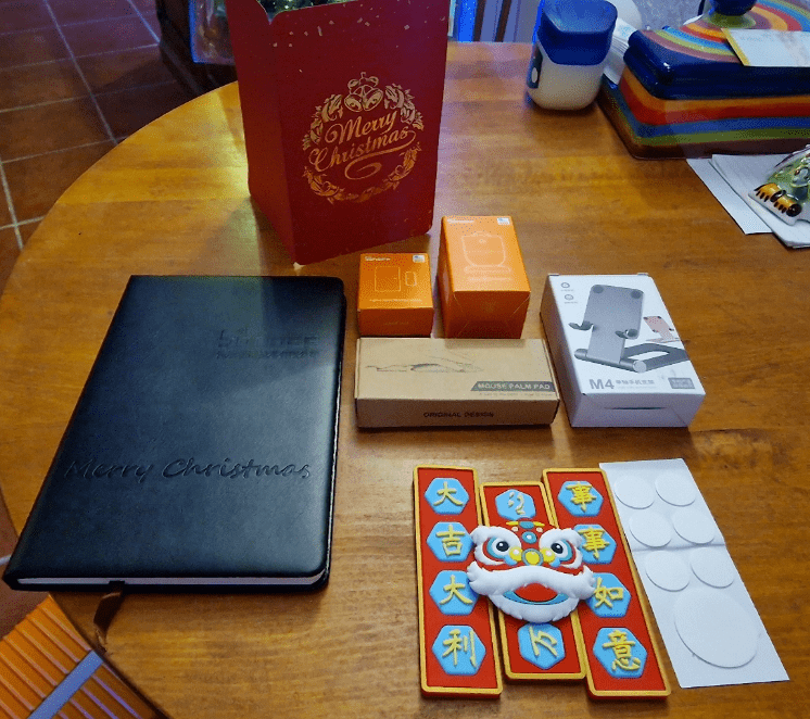 No, I’m not going to show you me wearing the cute, padded soft-material travel neck pillow that came in the box – but here’s the rest – all wrapped in Christmas paper – I removed that – we all know what Christmas wrapping looks like… A very nice card hand-written from Sue and the Sonoff team, an interesting diary (now why would they think someone with a smartphone would use a paper diary) all in Chinese – nicely bound in black (presumably) pleather, not fixed to any year and full of “useful” dialling codes for China, conversion tables, a ruler, international clothes sizes (that IS useful), address book section, oh, 100+ pages for notes – and all Sonoff branded with a “Merry Christmas” on the front. I can always use a decent notepad. Nicely done.