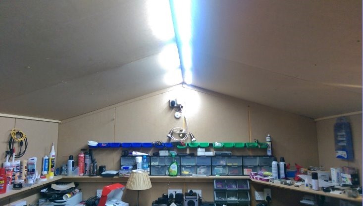 It was not until I turned the unit on complete with LED strips that I realised the point of the high voltage! BOY is that bright – and in the example you see above, only the COLD lights are on as I screwed up somewhere and the WARM lights are not on – I’ll fix that in daylight tomorrow. With both on, you could perform surgery there is so much light. In short – if you need overall lighting for a shed or small office – this absolutely does the job. They have screw holes all along the strip length – but I simply stuck double sided adhesive on the 4 lengths of strip and they’re holding onto the ceiling along with the controller, just fine.