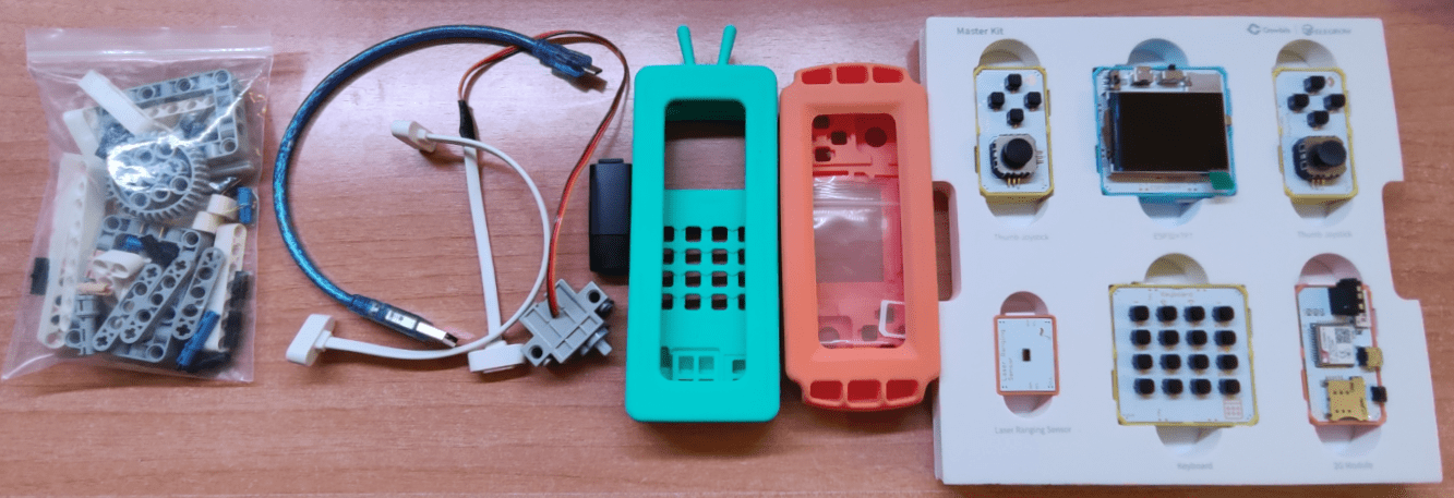 Fair comparison? Well, of course I’m an adult and not as easily impressed as pre-teen Pete and the Philips kit had more in the way of coils of wire than sophisticated components – but expectations have changed beyond all belief since mid-last-century and so (early) this morning I opened the first box “Master Kit” and was pleasantly surprised. Inside, a pair of plastic “Thumb Joystick” modules, an “ESP32+TFT” module, a “keyboard” module, a “2G” module and a “laser ranging sensor” module, all intended to connect magnetically. That at least was in the top part of the box.