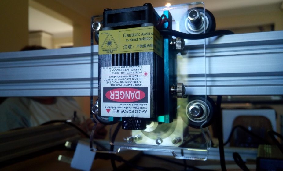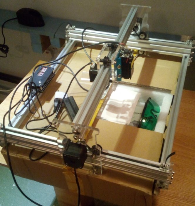 Last year year I put together this excellent A3 laser engraving machine. Originally, a 500mW laser module arrived complete with its own power supply (the laser which was not included in the basic kit). It turns out that was the wrong laser and now I have the 2300mW violet laser complete with upgraded 2.5A power supply. In the photo you also see the (important) green protective glasses that came with the kit.