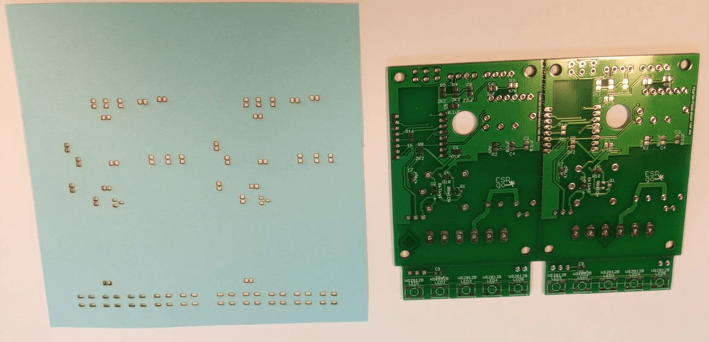Above, the soldering mask and the JLC PCB boards (second batch) which arrived late November 2018. The mask which is made using the engraver with the 2w+ laser, will make soldering these boards much easier.