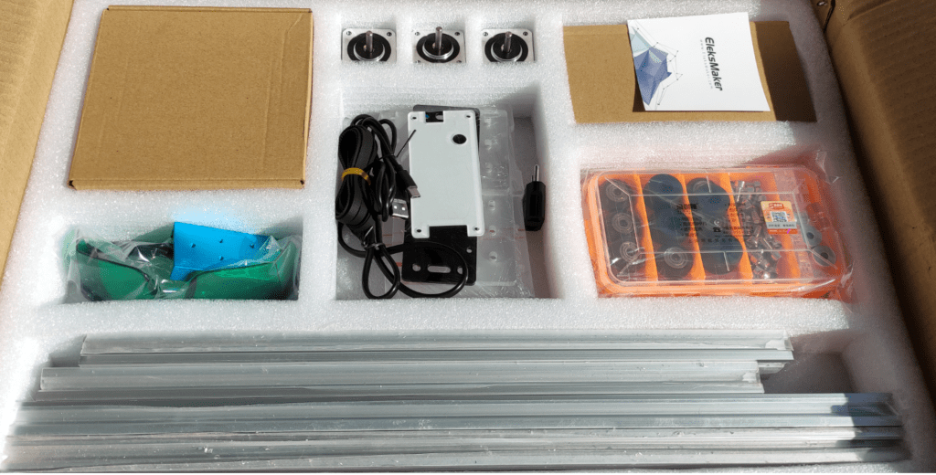 Above you see 5 aluminium sections, the actual laser is in the box on the top left, the power supply is in the box on the top right, various perspex parts plus cables in the centre, 3 stepper motors at the top centre, safety glasses and laser clamp left, wheels and countless nuts and bolts on the right (double-sides box). Yes, it is intimidating for the first hour but construction went ahead without a hitch, really.