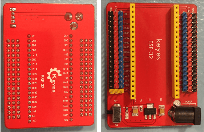 As an aside, I just received a KEYES ESP-32 board from Banggood – indeed the same as the Keystudio board but red which makes the lettering easier to read – maybe a later model?… Bangood refer to it as a . Here it is….