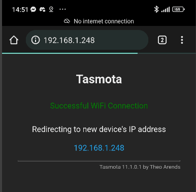 Dead chip? No. Tasmota flasher again – Tasmota32-C3? No, not supported.. Back to the Solo-1 – release version this time – again ERASING ALL first. Again, flashing success – wrapping up – success. Back to my phone – device tasmota-E0F06C-xxxx available. My phone took me to the usual setup page, I put the device on my network as I’ve done a million times with ESP8266 and ESP32 devices.. Tasmota connected 192.168.1.248