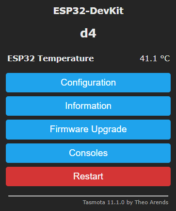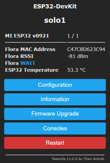 The device appeared with internal temperature 52c. But hitting any button in the web setup resulted in – ZILCH – NOTHING. I wondered if my network was in tourble so I plugged in an ESP32 I’d been working with only a couple of days before – one I’d called solo1. Perfect.