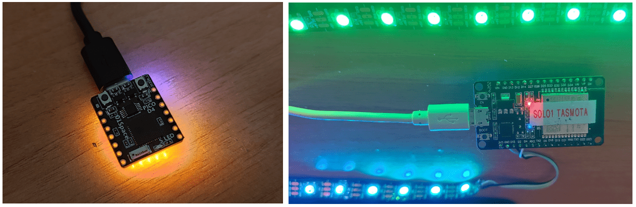 It is possible that Tasmota was not the best choice of test for either board as I was not happy with “rainbow” performance on either. WLED on the other hand works perfectly – notably it also works a treat on ESP8266 but WLED can’t do any more – like driving general input peripherals and outputs – so really we’re not comparing like for like. I’ve had problems with rainbow displays and Tasmota in the past and just assumed they were fixed – maybe not.