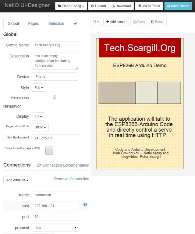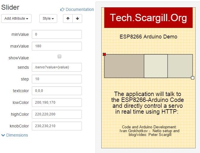Along the way I met up with Ivan Grokhotkov who as some of you know has done a lot of work to bring the Arduino environment to the ESP8266 community. As part of what we were doing at MIT, Ivan and I decided to put together a simple demonstration – this would use NETIO (my favourite IOS/Android visual interface) and ESP8266-Arduino to help an ESP board drive a servo via wireless control.