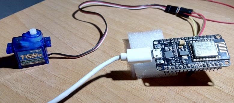 It REALLY is that simple to drive a servo – in my case the 3-wire DIRT CHEAP servo is a Turnigy TG9e with 3 wires – ground, power (3v3 in my case) and signal (D5 – but doesn’t have to be that pin).
