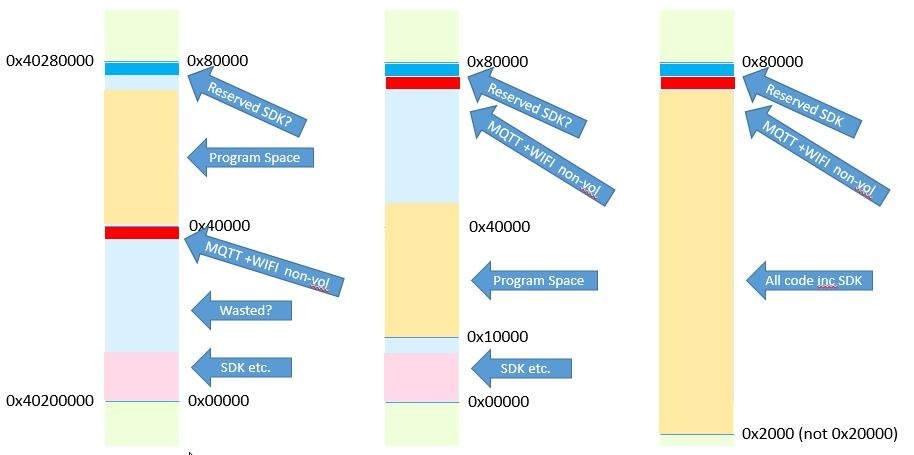 What you see above – the left 2 columns represent the very original code I used with TuanPM’s MQTT as the base. In the middle one I’d moved non-volatile storage up to the top of available FLASH space (which applies to most of the current crop of boards from ESP-01 upwards) and moved the start of code all the way down to 0x10000 giving a massive amount of room for development – unlike the original case where I was running out.
