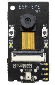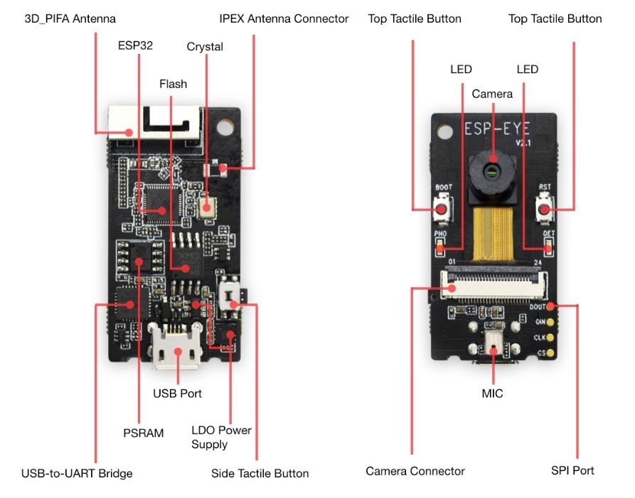 The ESP-EYE has the ESP-32, 2 Megapixel camera, microphone, 7MB of PSRAM and 4Mbyte of Flash. The ESP-EYE supports image transmission over WIFI and debugging through a micro-USB port.