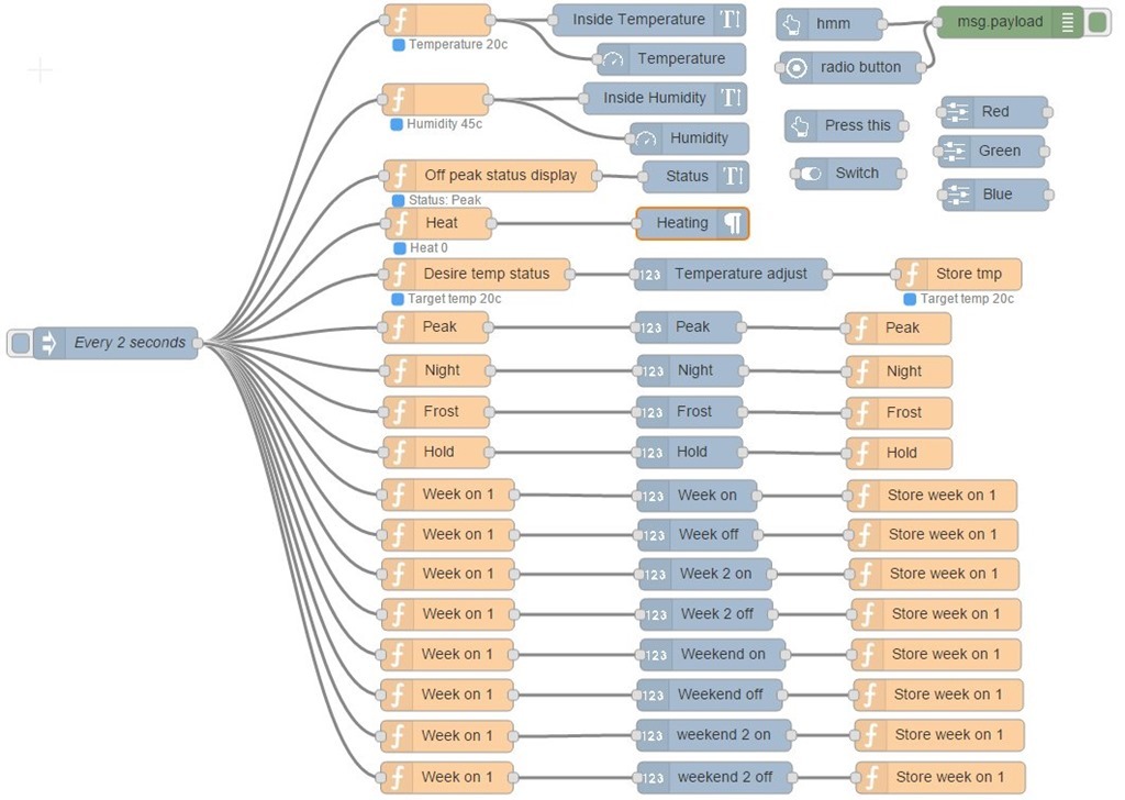 This will soon pale into insignificance as I add RGB lighting, zone-dependent heating, security and other controls but not until I’m sure the web access is reasonably secure. Meanwhile, as you can see over on the top right there are a couple of experiments going on – but the main section is that attached to the 2-second injector. I store my heating information in global variables in Node-Red so that any page can interact with them. I already have a decent NEXTION display for locally controlling the heating – but I’ve been struggling to get what I want in terms of a mobile interface.