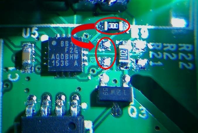 So after I lost the original resistor and 2 replacements in the carpet I finally managed , despite my resistors being one size up from these, to get a 0 ohm resistor to the right of that chip above in the place I’ve marked with a ring – you can see it was a choice – go into the radio chip OR go off to the button.