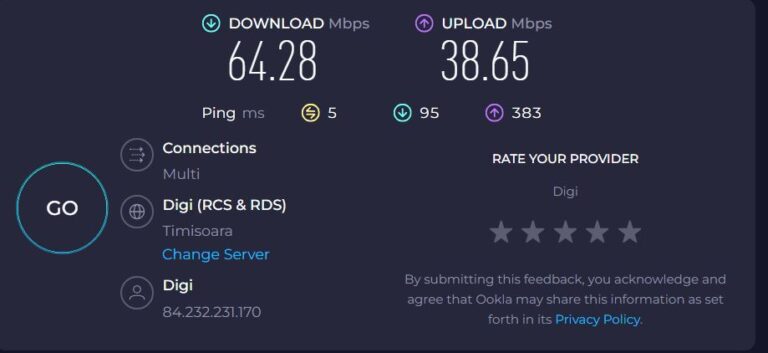 WELL, 64Mb/s is “ok” but can’t argue with the price – very nice. Where are you based? I’m paying £18 a month for broadband in the UK (no fibre option, edge of town) 30Mbps down, THREE Mbps up – and €15 a month in Spain for 4g (soon 5g hopefully) 60-110Mbps down, maybe 50Mbps up (varies).