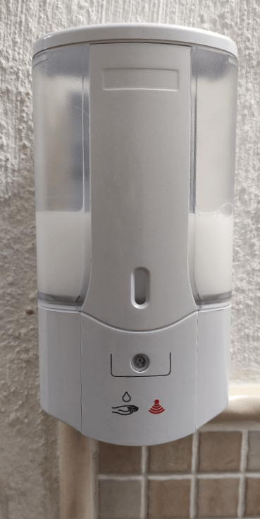 How does the soap dispenser work? Well, as you put your hand under the unit, the battery triggers a small motor which dispenses a suitable amount of foaming soap before stopping. On the top of the unit is a plastic-key-operated, largely pointless “locking” mechanism.