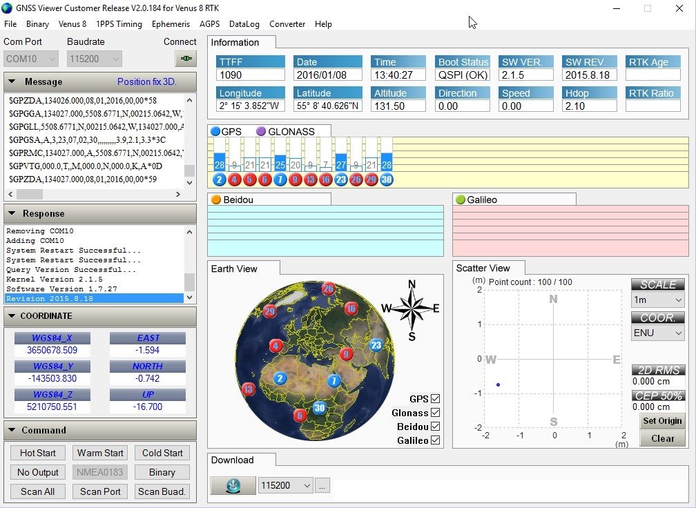 They have a download for Windows – an EXE program that just runs. I shut down my Arduino IDE, punched the UART and speed details into their program and…about my only gripe is that even with the unit stuck in the centre of the dormer window – it would pick up on the right time – but not the location. After 15 minute still no location. I downloaded an AGPS file and a whole boatload of satellites appeared – but still no location.