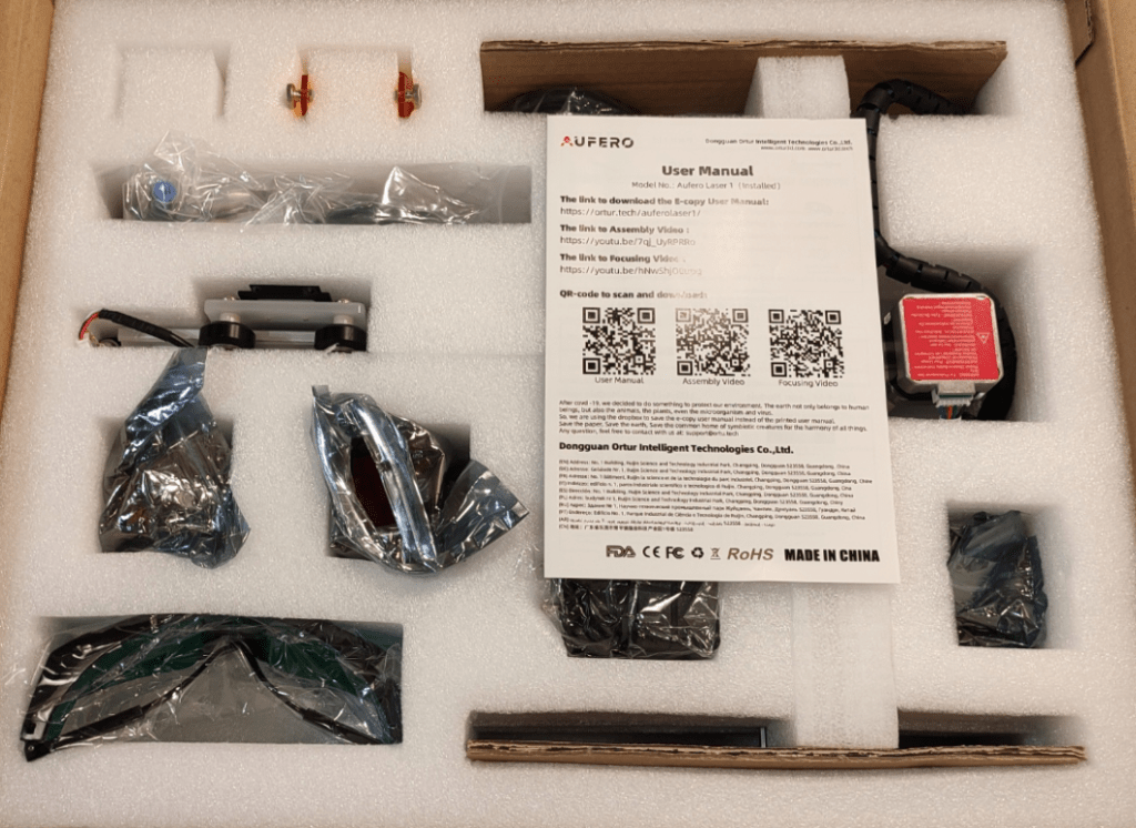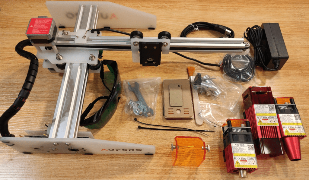 And here, below, we have all the bits with plastic packaging suitably removed. Despite the “entry level” tag, the Aufero has a lot going for it – the small footprint means you can fit it on a (deep) shelf instead of it taking up desk space – and I find that MOST of the items I engrave are small enough to easily fit. If space is limited, this device may well find a welcome home – and as you’ll see later, the available lasers are anything but toys.